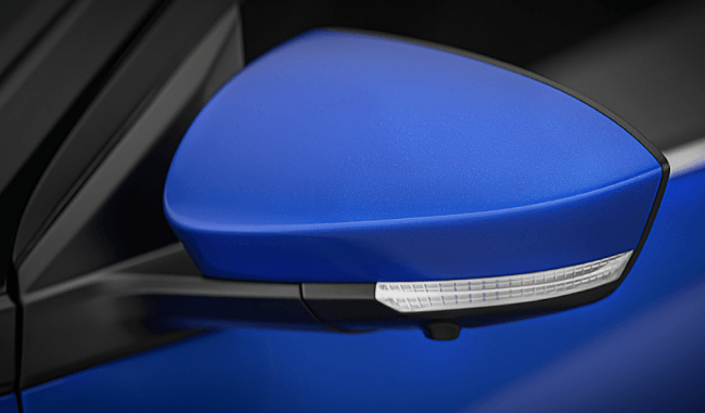 17" de liga leve com acabamento na cor preta, acabamento interno com partes revestidas de couro e material sintético preto, faróis de LED e retrovisor externo com rebatimento automático, pintado na cor da carroceria, com luz indicadora de direção em LED integrada.
